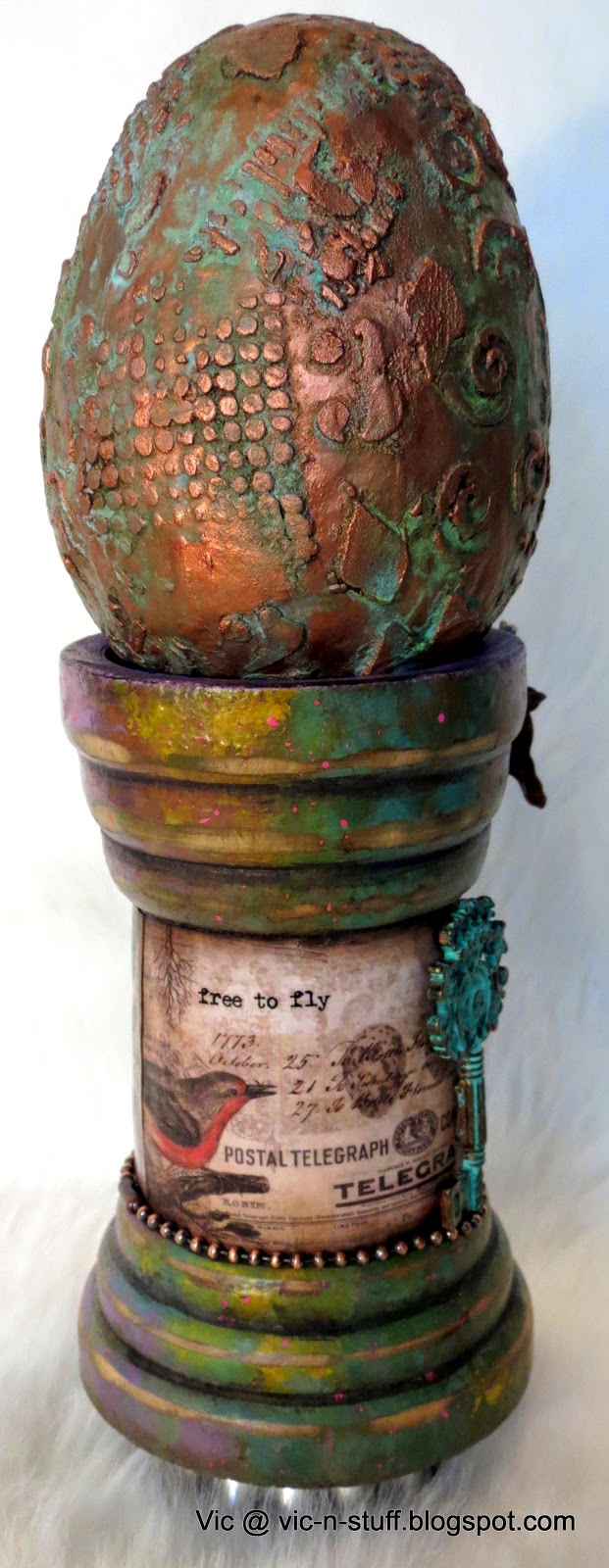 I wanted the photo to be the star so I didn't want to make it too gobby. I covered the paper mache box with scrapbook paper. The frame around the photo is grunge board embossed with the dot embossing folder and painted with distress paint. I sanded it a little and used distress ink to make it look old.